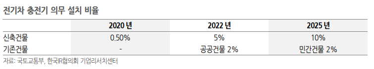 한국은 전기차 100대당 충전기 수가 50기 수준으로 아 향후 설치될 충전기 수요가 높은 편이다(전기차 100대당 일본 153기, 미국 185기, 독일 230기, 영국 318기 ). 또한 국내 소비자의 전기차 이용 시 우려사항 1순위로 공공충전 인프라 부족(비중 26%)이 선택된 만큼 신규 전기차 충전기 설치 가속화가 진행될 것으로 예상된다.
